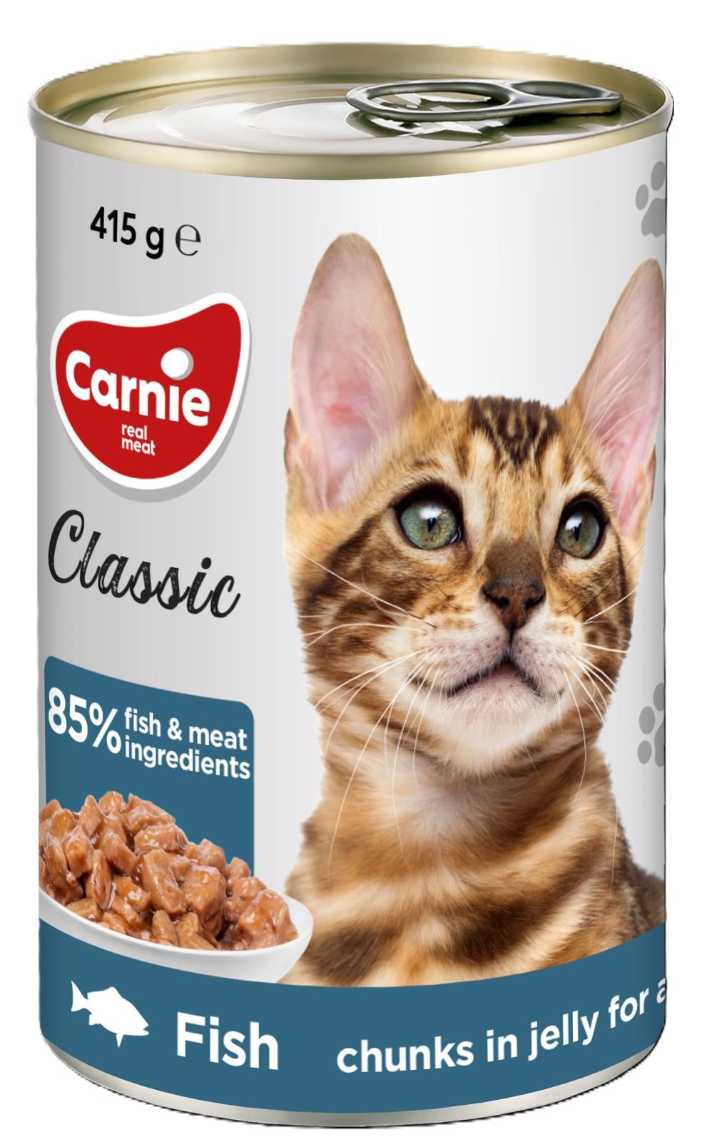 Kaķu konservi pieaugušiem kaķiem gaļas gabaliņi želejā ar zivi, gaļa 85% 415g
