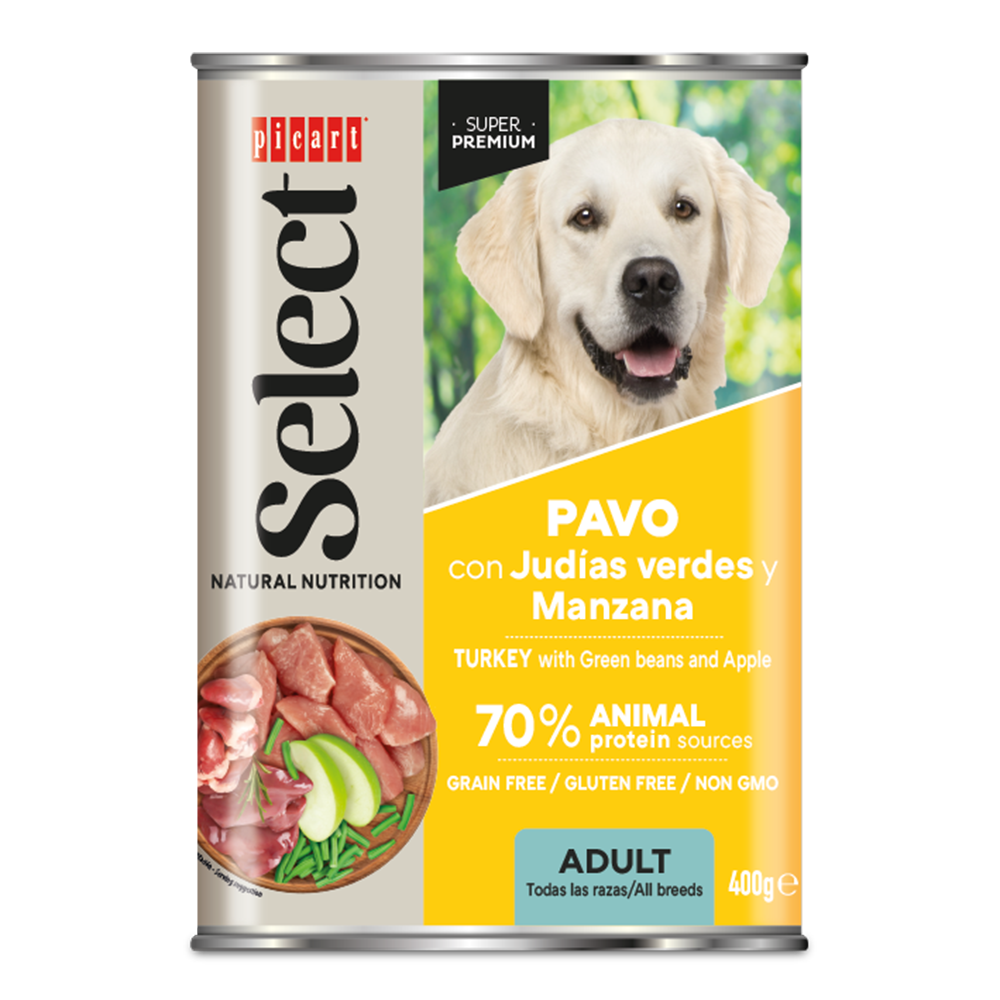 Suņu konservi pieaugušiem suņiem ar tītara gaļu, zaļajām pupiņām un āboliem 400g
