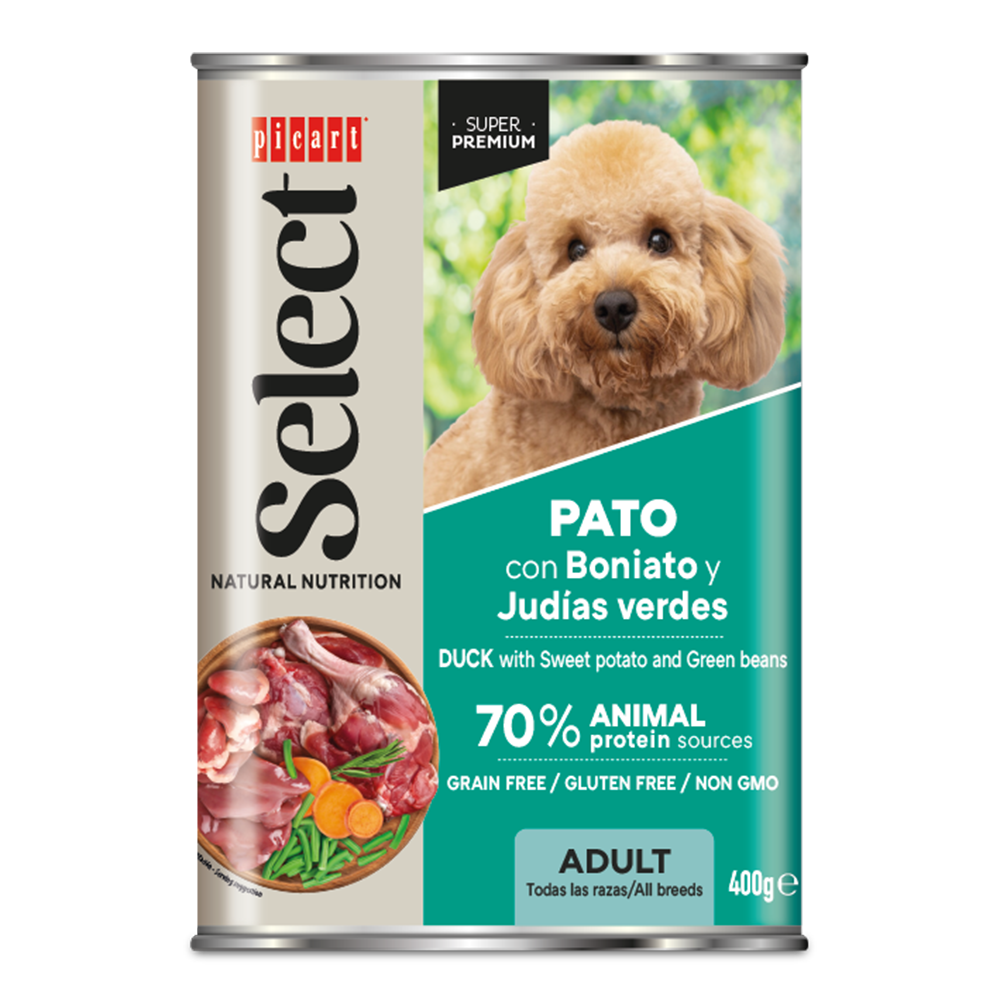 Suņu konservi pieaugušiem suņiem ar pīles gaļu, saldajiem kartupeļiem un zaļajām pupiņām 400g