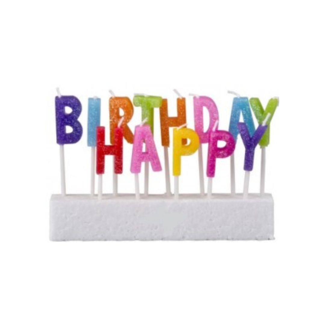 Tortes svecītes krāsaini burtiņi ar spīdumiņiem HAPPY BIRTHDAY 13 gab.